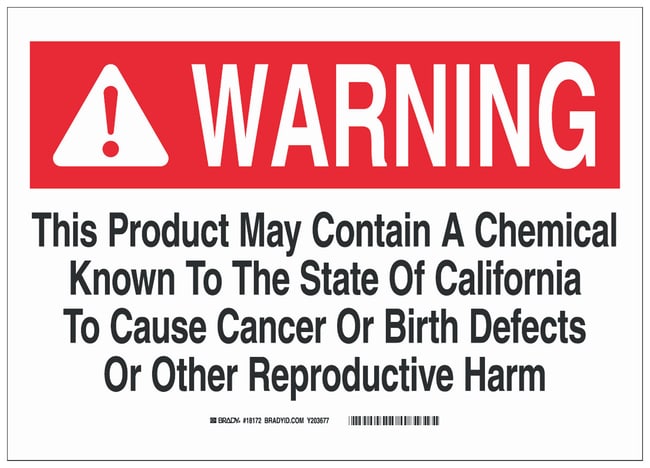 Brady™ Aluminum Warning Sign: THIS PRODUCT MAY CONTAIN A CHEMICAL KNOWN TO THE STATE OF CALIFORNIA TO CAUSE CANCER OR BIRTH DEFECTS OR OTHER REPRODUCTIVE HARM