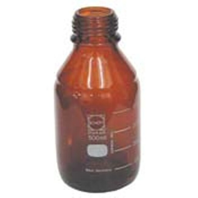 Manufactured from Type 1 Class A Borosilicate Glass. This bottle protects is contents up to 500nm or UV radiation. These bottles are specifically suitable for preparing light sensitive media and for storing substances for extended periods of time. OD X OAH (MM):86 X 176. MADE IN THE USA