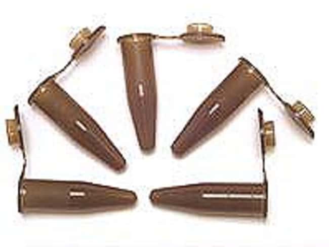 Amber color tubes block light transmission that can adversely affect fluorescent and other light sensitive samples. Tubes filter out light and withstand high speed centrifugation up to 17,000 x g. Feature molded external graduations and frosted surfaces for marking. Hinged lid provides a soft piercing point for inserting a needle. Chemical resistant and autoclavable polypropylene. RNASE, DNASE free