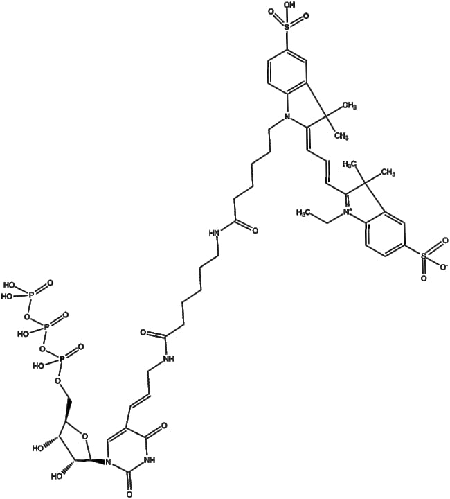 Aminoallyl-UTP-X - Cy3 is a modified nucleotide analog designed for fluorescent labeling of RNA molecules Structurally it is composed of uridine triphosphate (UTP) conjugated to a Cy3 fluorophore via an aminoallyl linker enabling its incorporation during in vitro transcription reactions Once integrated into RNA transcripts Cy3-labeled RNA can be visualized by standard fluorescence imaging techniques Based on these properties Aminoallyl-UTP-X - Cy3 is applicable in RNA visualization RNA localization studies RNA-protein interaction assays and fluorescence-based RNA detection in biomedical research