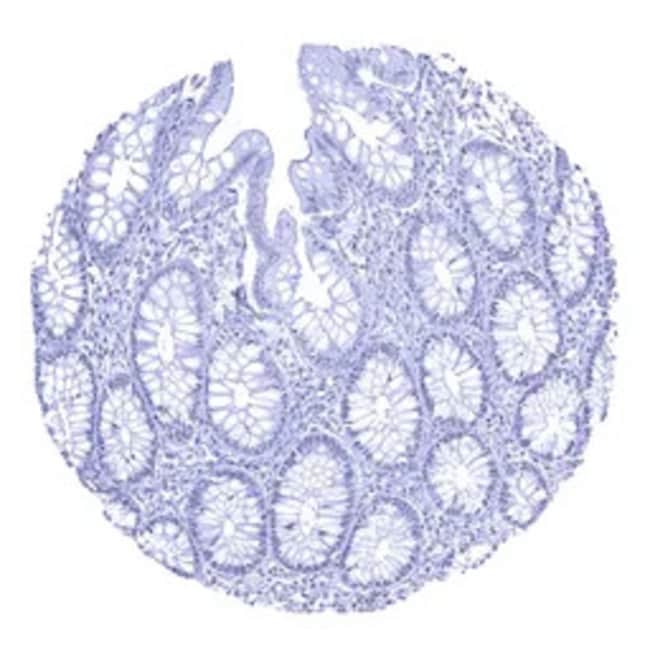 "The Androgen Receptor antibody [MSVA-367R] HistoMAX™ (GTX04368) is a Rabbit Monoclonal antibody in the GeneTex HistoMAX portfolio. The antibody is extensively evaluated for IHC-P using formalin-fixed human normal tissues (more than 70 different sections) and cancer tissue arrays to guarantee specificity and best-in-class performance. Information regarding both manual and autostainer staining protocols are available.Figure Legend: IHC-P analysis of human colonic mucosa tissue using GTX04368 Androgen Receptor antibody [MSVA-367R] HistoMAX. Complete absence of androgen receptor staining in normal colon mucosa."