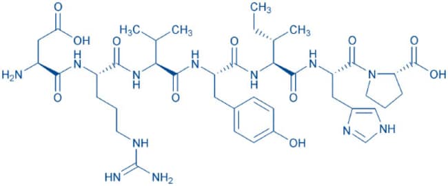 Angiotensin I/II (1-7) Trifluoroacetate, H-Asp-Arg-Val-Tyr-Ile-His-Pro-OH, 51833-78-4, C41H62N12O11, Mr 899.02, 25mg. Angiotensin (1-7), DRVYIHP, an enzymatically produced peptide of the renin-angiotensin system, shows pharmacologically distinct, tissue-specific actions that differ from those of angiotensin II. Angiotensin (1-7) shows considerable cardiovascular and antiangiogenic activity. Iusuf et al. reviewed its phamacological properties and pharmacotherapeutic perspectives. Moreover, the heptapeptide was shown to inhibit the growth of human lung cancer cells in vitro and to reduce the size of human lung cancer xenografts in vivo.