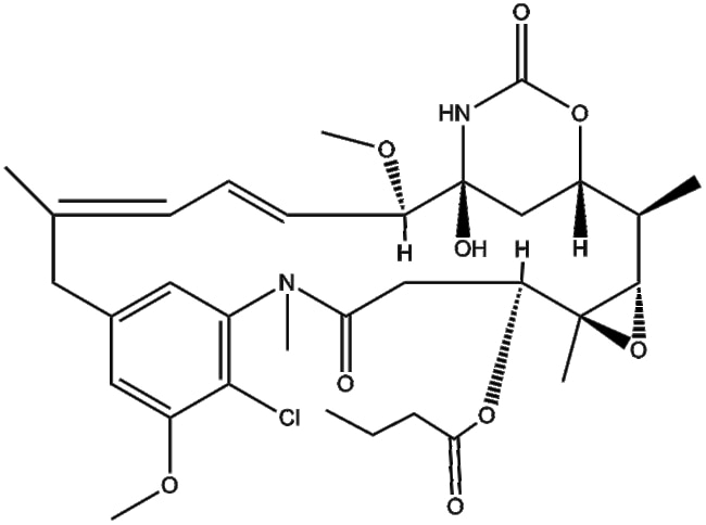 Ansamitocin P-3 (CAS 66547-09-9) is a small-molecule inhibitor targeting tubulin It is designed to disrupt microtubule assembly by potently inhibiting tubulin polymerization thereby affecting cellular processes reliant on microtubule dynamics Ansamitocin P-3 exerts its biological activity primarily through inhibition of tubulin polymerization In cell-based studies Ansamitocin P-3 demonstrates cytotoxicity with IC50 values of approximately 4 10 g/ml in human lung carcinoma A-549 and colon carcinoma HT-29 cells and 2 10 g/ml in breast carcinoma MCF-7 cells Additionally it inhibits ciliary regeneration in Tetrahymena cells at concentrations around 1 M Based on these pharmacological properties Ansamitocin P-3 holds research potential in oncology particularly in studies of microtubule dynamics anticancer drug mechanisms and ciliogenesis