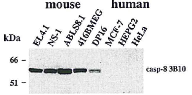 anti-Caspase-8 (mouse), mAb (3B10), AdipoGen Life Sciences. Monoclonal Antibody. Recognizes the p20 subunit of mouse caspase-8. Detects bands of ~55kDa (full-length caspase-8) and ~18kDa (apoptosis-induced cleavage fragment) by Western blot. Does not cross-react with human caspase-8. Isotype: Rat IgG1kappa. Clone: 3B10. Applications: ELISA, FACS, ICC, IHC, WB. Liquid. In PBS containing 0.02% sodium azide. Procaspase-8 belongs to the family of caspases. Binding of FasL to Fas leads to formation of a receptor complex at the cellular membrane, which was named DISC. The DISC consists of oligomerized receptors, the DD-containing adaptor molecule FADD, procaspase-8, procaspase-10 and c-FLIP. The DISC structure provides a platform for the oligomerization of procaspase-8 that allows two procaspase-8 homodimers to be in the close proximity leading to the initial activation of procaspase-8. At the first cleavage step, the N-terminal p43/p41 and the C-terminal p30 cleavage products are generated.