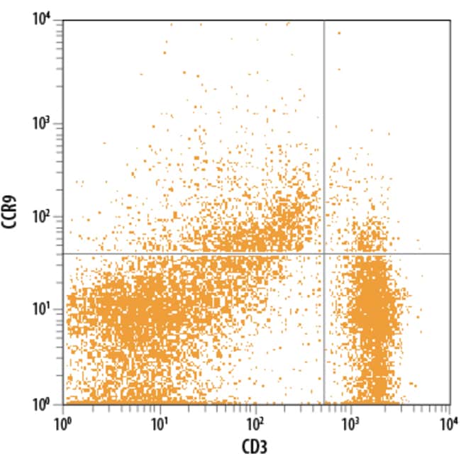 Detects mouse and rat CCR9 in flow cytometry. Stains mouse CCR9-transfected cells but not irrelevant transfectants. |