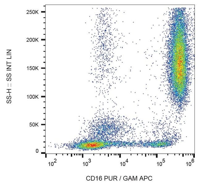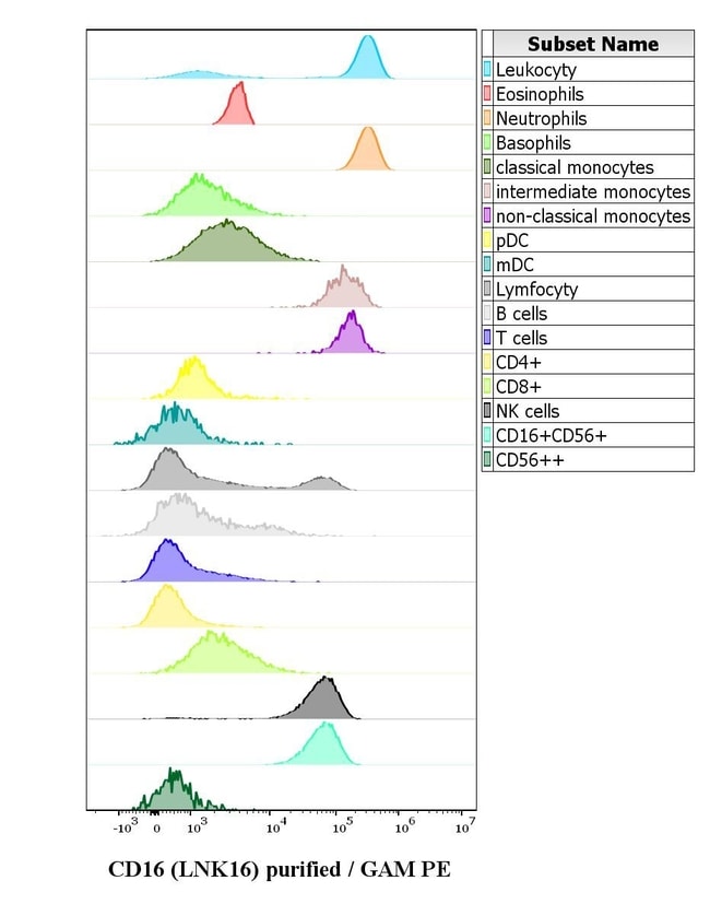 This antibody reacts with an extracellular epitope of CD16, a low affinity receptor for aggregated IgG (FcgammaRIII antigen). CD16 exists in two different isoforms: CD16a (FcgammaRIIIA; 50-65 kDa; expressed on NK-cells, monocytes and macrophages) and CD16b (FcgammaRIIIB; 48 kDa; mainly expressed on neutrophils).