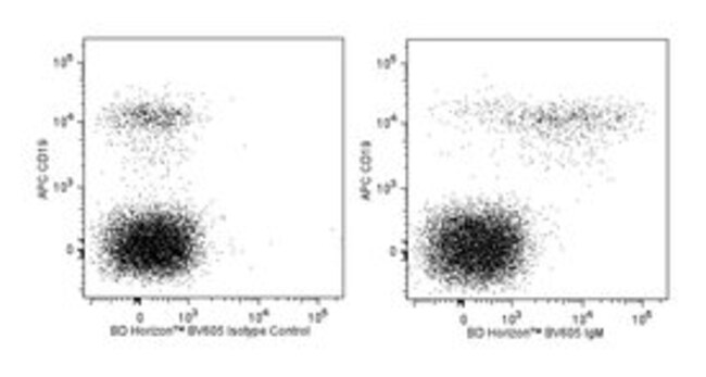 This antibody is conjugated to BD Horizon™ BV605 which is part of the BD Horizon™ Brilliant Violet™ family of dyes. With an Ex Max of 407-nm and Em Max of 602-nm, BD Horizon™ BV605 can be excited by a violet laser and detected with a standard 610/20-nm filter set. BD Horizon™ BV605 is a tandem fluorochrome of BD Horizon™ BV421 and Cy™3.5. Due to the excitation of Cy3.5 by the green (532 nm) and yellow-green (561 nm) lasers, there will be significant spillover into the PE and BD Horizon™ PE-CF594 detectors off the green or yellow-green lasers. BD Horizon™ BV605 conjugates are very bright, often exhibiting brightness equivalent to PE conjugates and can be used as a third color off of the violet laser.
