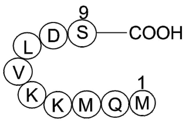 Anti-Inflammatory Peptide 1 (CAS 118850-71-8) is a synthetic nonapeptide (H-Met-Gln-Met-Lys-Lys-Val-Leu-Asp-Ser-OH C45H82N12O14S2) structurally related to regions of uteroglobin and lipocortin I This peptide demonstrates significant inhibitory activity against phospholipase A2 (PLA2) an enzyme whose elevated expression and activity are associated with inflammatory responses By suppressing PLA2 Anti-Inflammatory Peptide 1 effectively reduces inflammation in vivo Owing to its characterized mechanism of modulating lipid mediator pathways it serves as a valuable tool for studying anti-inflammatory mechanisms and exploring new therapeutic strategies for inflammatory disorders