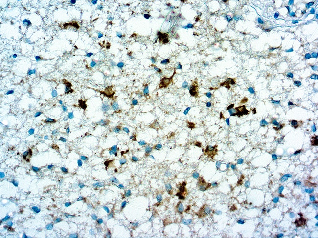 Antihuman isocitrate dehydrogenase 1 (IDH1) R132H antibody binds to IDH1-mutated protein, but does not bind the wild-type IDH1 protein. IDH1 R132H point mutations are frequently seen in World Health Organization grade II and III gliomas and are believed to constitute an early step in tumorigenesis. IDH1 R132H can be used as a diagnostic marker to help differentiate infiltrating gliomas from gliosis, and as a prognostic marker for gliomas and secondary glioblastoma multiforme. IDH1 R132H antibody shows strong cytoplasmic staining and weaker nuclear staining in tumor cells with the R132H-mutated peptide. Diffuse staining of the fibrillary tumor matrix is also seen.