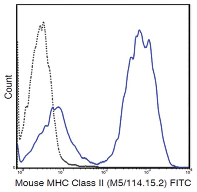 The M5/114.15.2 antibody reacts with mouse MHC Class II alloantigens I-Ab, I-Ad, I-Aq, I-Ed, and I-Ek, as well as being cross-reactive with mouse cells of H-2p and H-2r haplotype. MHC Class II is widely expressed by mouse immune cells bearing these alloantigens, including T and B cells, monocytes, macrophages, and dendritic cells. The antibody does not react with the following alloantigens: I-Af, I-Ak, I-As, or NOD H-2g7The M5/114.15.2 antibody may be used for analysis of mouse cells expressing MHC Class II alloantigens as described. Please note that the M5/114.15.2 clone may also be referred to as M5/114 in the literature.Specifications