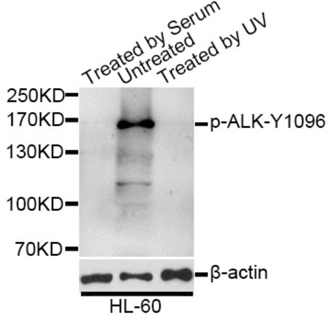 Immunogen: A synthetic phosphorylated peptide around Y1096 of human ALK (NP_004295.2).•Host Species: Rabbit•Isotype: IgG•Species Reactivity:Human•Validated Applications:WB•Swiss Prot: Q9UM73•Gene ID:238•Purification Method:Affinity purification•Storage: Store at -20℃. Avoid freeze / thaw cycles.|Buffer: PBS with 0.02% sodium azide,50% glycerol,pH7.3.This product is available in 20UL, 50UL, 100UL, and 200UL. Please contact customer service for pricing and availability on alternative sizes.