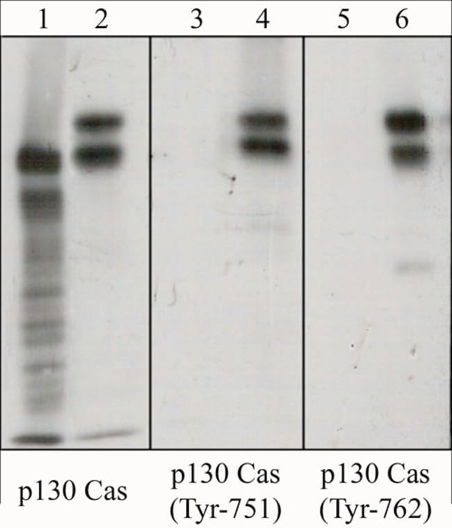 This antibody was cross-adsorbed to phospho-tyrosine coupled to agarose and to phospho-p130 Cas (Tyr-762) peptide before affinity purification using phospho-p130 Cas (Tyr-751) peptide (without carrier). The antibody detects a 130 kDa* protein corresponding to the molecular mass of phosphorylated p130 Cas on SDS-PAGE immunoblots of pervanadate treated human endothelial and A431 cells, but is not observed in control cells. The immunogen was Phospho-p130 Cas (Tyr-751) synthetic peptide (coupled to KLH) corresponding to amino acid residues around tyrosine 751 in rat p130 Cas. This rat sequence is the same as Tyr-653 in human p130 Cas and Tyr-657 in mouse p130 Cas. Accession #Q63767. Applications = WB, E; Species Reactivity = Hu, Rt, Ms; Size = 100 μl; Buffer = PBS, 50% glycerol, 1 mg/ml BSA, and 0.05% sodium azide. Store at –20°C. Stable for 1 year. Other Names = BCAR1, Cas