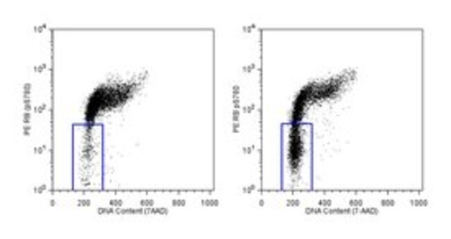 The retinoblastoma gene product (Rb) is well known as a tumor suppressor and is either absent or mutated in many human tumors. Retrovirus-mediated gene transfer of the wild-type Rb gene into several Rb mutant neoplastic cell lines suppresses their tumorgenicity. Rb is a 110kDa nuclear phosphoprotein that undergoes differential phosphorylation during the cell cycle. During G1 phase, Rb is predominantly in a hypophosphorylated state. It becomes increasingly phosphorylated throughout the cell cycle until late mitosis, when substantial dephosphorylation occurs. Hypophosphorylated Rb interacts with a number of cellular proteins including the E2F transcription factor, several cyclins, RBP-1, RBP-2, c-Abl, c-myc, N-myc, and p46. Phosphorylation of Rb at various sites, by Cyclin-dependent protein kinases, inhibits the binding of Rb to these proteins. Rb is thought to mediate its effects, in part, via the repression of genes required for proliferation. For example, Rb is specifically recruited to promoters containing E2F sites and actively represses E2F mediated transcription. Rb also stimulates the activity of other transcription factors, although the mechanisms are less clearly defined. Thus, Rb appears to regulate transcription in its aim to control cell growth. The J146-35 monoclonal antibody recognizes Rb phosphorylated at serine 780 (pS780), which affects Rb binding to E2F. The orthologous phosphorylation sites in mouse and rat Rb are serines 773 and 751, respectively.
