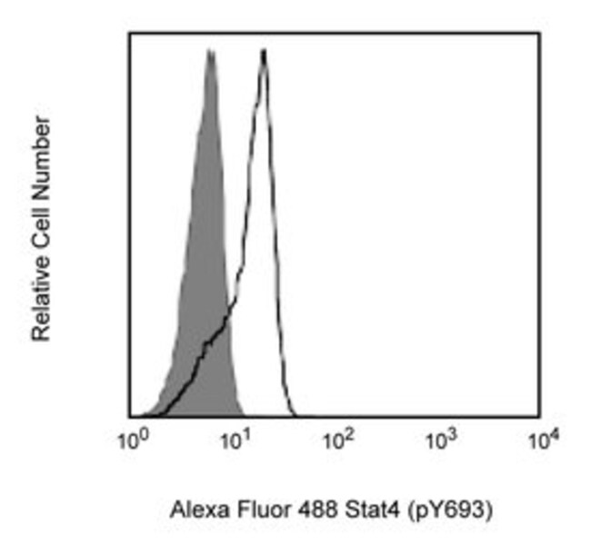 The Stat proteins function both as cytoplasmic signal transducers and as activators of transcription. Seven mammalian Stat proteins have been identified: Stat1-4, Stat5a, 5b, and Stat6. Stat4 has been shown to play an important role in development of T helper cells, specifically the Th1 subset. Stat4 is activated by IL-12 and by type 1 interferons. Knockout mice supported the role that Stat4 plays in IL-12 signaling because lymphocytes from Stat 4-/- mice could not differentiate into Th1 cells or produce IFNγ in response to treatment with IL-12. IFNγ plays an important role in host defense. A key component in the activation of Stat4 is the phosphorylation on tyrosine and serine residues in response to IL-12 stimulation. IL-12 stimulation leads to the phosphorylation of Stat4 on tyrosine 693 and serine 721. Transcriptional activity of Stat4 has been shown to be significantly reduced when residues Y693 and S721 are mutated. This antibody is routinely tested by flow cytometric analysis. Other applications were tested at BD Biosciences Pharmingen during antibody development only or reported in the literature.