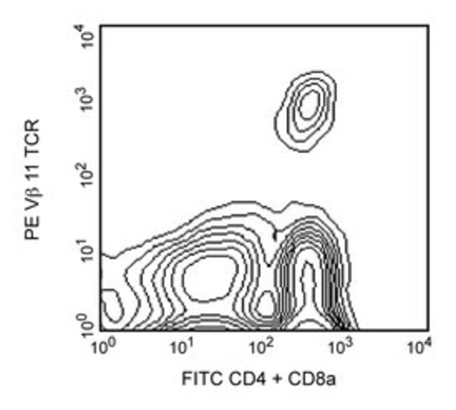 The RR3-15 antibody reacts with the Vβ 11 T-Cell Receptor (TCR) of mice having the b haplotype (e.g., A, C57BL, C58, DBA/1) of the Tcrb gene complex. The Tcrb-V11 gene locus is deleted in mice having the a (e.g., C57BR, C57L, SJL, SWR) and c (e.g., R