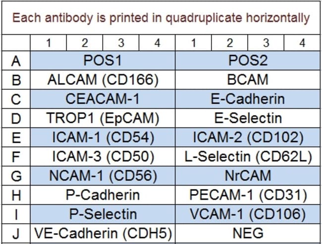 Detects detects 17 human cell adhesion molecules. Suitable for all liquid sample types. Quantitative, Sandwich-based, Glass Slide Antibody Array. Simultaneous quantitative measurement of multiple proteins in a wide variety of sample types. Quantibody combines the high specificity and sensitivity of ELISA with the high throughput of the glass chip-based array. Less sample, more data: only 50 ul of sample is needed for quantification of up to 40 cytokines. Proteins detected: ALCAM (CD166), BCAM, CEACAM-1, E-Cadherin, TROP1 (EpCAM), E-Selectin, ICAM-1 (CD54), ICAM-2 (CD102), ICAM-3 (CD50), L-Selectin (CD62L), NCAM-1 (CD56), NrCAM, P-Cadherin, P-Selectin, PECAM-1 (CD31), VCAM-1 (CD106), VE-Cadherin (CDH5)