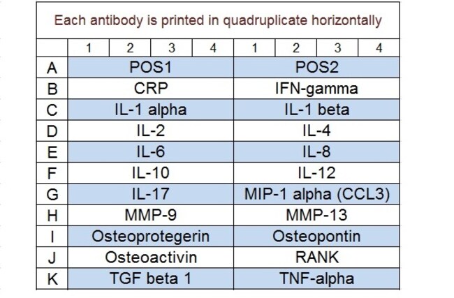Detects 20 Human Cytokines. Suitable for all liquid sample types. Quantitative, Sandwich-based, Glass Slide Antibody Array. Simultaneous quantitative measurement of multiple proteins in a wide variety of sample types. Quantibody combines the high specificity and sensitivity of ELISA with the high throughput of the glass chip-based array. Less sample, more data: only 50 ul of sample is needed for quantification of up to 40 cytokines. Proteins detected: CRP (C-Reactive Protein), IFN-gamma, IL-1 alpha (IL-1 F1), IL-1 beta (IL-1 F2), IL-10, IL-12 p70, IL-17A, IL-2, IL-4, IL-6, IL-8 (CXCL8), MIP-1 alpha (CCL3), MMP-13, MMP-9, Osteoactivin (GPNMB), Osteopontin (SPP1), Osteoprotegerin (TNFRSF11B), RANK (TNFRSF11A), TGF beta 1, TNF alpha