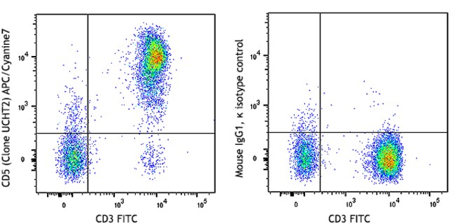APC/Cyanine7 anti-human CD5 [UCHT2]; Isotype: Mouse IgG1, κ; Reactivity: Human; Apps: FC; Size: 25 tests