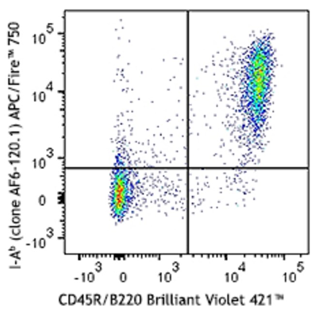 APC/Fire™ 750 anti-mouse I-Ab [AF6-120.1]; Isotype: Mouse (BALB/c) IgG2a, κ; Reactivity: Mouse b haplotype, cross-reacts with H-2k and H-2u haplotypes; Apps: FC; Size: 100 ug