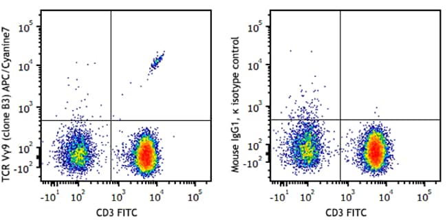 APC/Cyanine7 anti-human TCR Vγ9 [B3]; Isotype: Mouse IgG1, κ; Reactivity: Human, Cross-Reactivity: Chimpanzee, Cynomolgus; Apps: FC; Size: 25 tests