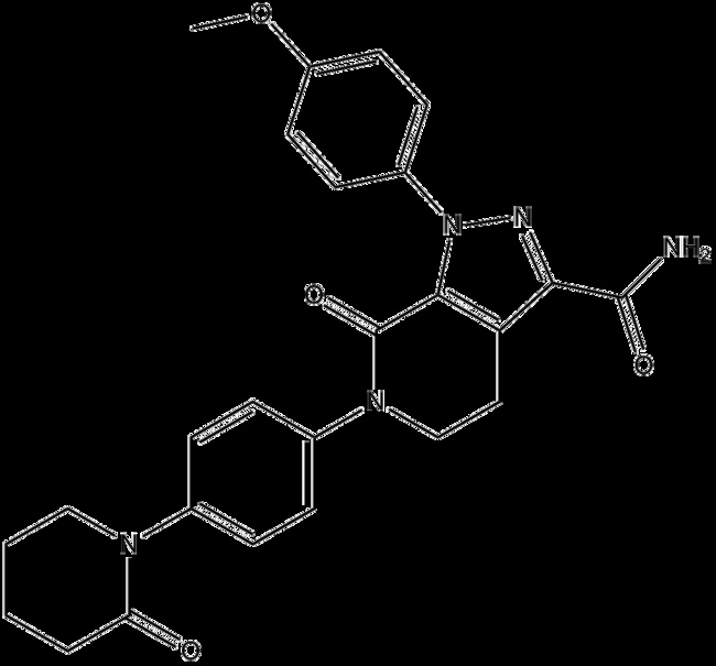 Apixaban (CAS 503612-47-3) is a highly selective reversible inhibitor of coagulation Factor Xa with Ki values of 0 08 nM and 0 17 nM for human and rabbit enzymes respectively By targeting Factor Xa a central serine protease in the coagulation cascade apixaban effectively impedes thrombin generation and subsequent clot formation In vitro apixaban prolongs coagulation parameters in human plasma at submicromolar concentrations and demonstrates potent antithrombotic activity across multiple animal models With favorable pharmacokinetics including high oral bioavailability and low clearance in preclinical studies apixaban serves as a valuable tool for investigating coagulation mechanisms and evaluating anticoagulant strategies