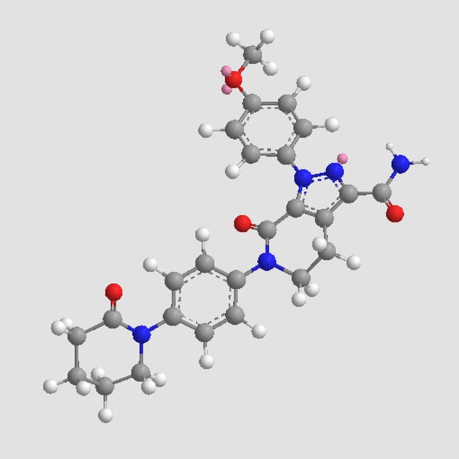 Apixaban (CAS 503612-47-3) is a highly selective reversible inhibitor of coagulation Factor Xa with Ki values of 0 08 nM and 0 17 nM for human and rabbit enzymes respectively By targeting Factor Xa a central serine protease in the coagulation cascade apixaban effectively impedes thrombin generation and subsequent clot formation In vitro apixaban prolongs coagulation parameters in human plasma at submicromolar concentrations and demonstrates potent antithrombotic activity across multiple animal models With favorable pharmacokinetics including high oral bioavailability and low clearance in preclinical studies apixaban serves as a valuable tool for investigating coagulation mechanisms and evaluating anticoagulant strategies