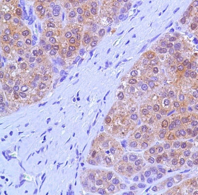 Heat-mediated antigen retrieval is recommended prior to staining, using a 10mM citrate buffer, pH 6.0, for 10 minutes followed by cooling at room temperature for 20 min. Following antigen retrieval, incubate samples with primary antibody for 10 min at room temperature. A suggested positive control is hepatocellular carcinoma.