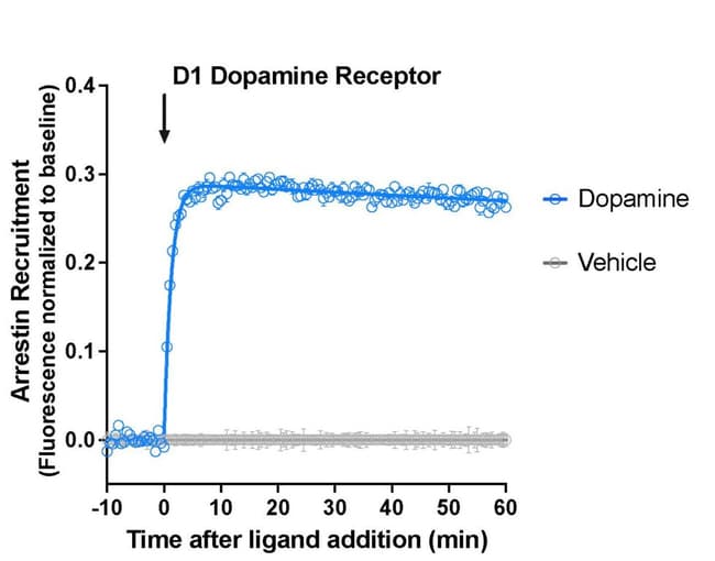 Measure arrestin signaling kinetics in real time with the live cell, fluorescent Borealis arrestin - D1 Dopaine Receptor (D1R) assay. Add the unmodified D1 receptor and Borealis sensor to cells and measure robust signals the next day on an automated plate reader or fluorescence imaging system. This assay is genetically encoded and packaged in BacMam for efficient transduction in most cell types - including uniform and near 100% efficiency in HEK293 cells as well as expression in many primary or iPSC-derived cells. The kit includes the arrestin sensor BacMam, D1R BacMam, 500mM sodium butyrate in H2O, and a positive control receptor and agonist (AT1R BacMam and 5mM Angiotensin II in H2O). Borealis kits for several other receptors are also available, and larger-sized kits are available on request. Other Montana Molecular tools including the cADDis cAMP sensor can be used alongside this assay.