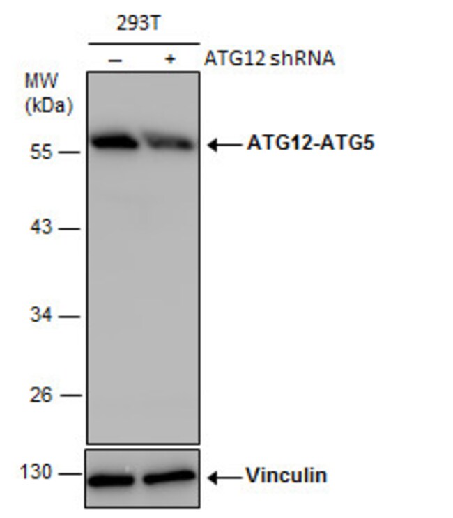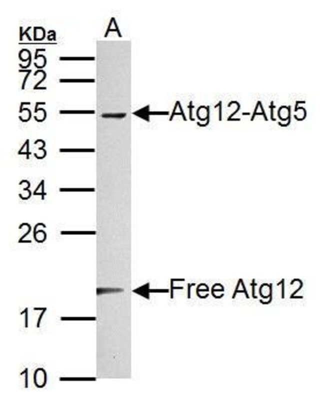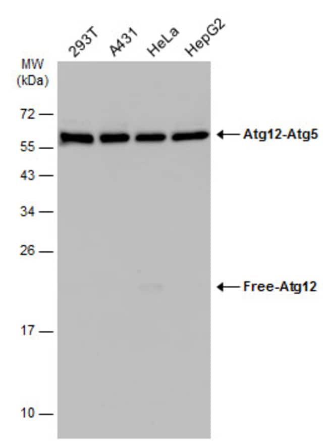 Recommended positive controls: 293T, A431, HeLa, HepG2, NIH-3T3, Rat brain, ATG12 shRNA-transfected 293T. Predicted reactivity: Pig (81%), Chimpanzee (96%). Store product as a concentrated solution. Centrifuge briefly prior to opening the vial.