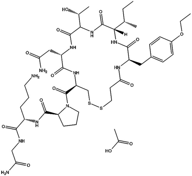 Atosiban acetate (CAS 914453-95-5) is a synthetic peptide functioning as a dual antagonist of the oxytocin receptor (OTR) and vasopressin receptors (V1aR V1bR V2R) It exhibits high affinity for human OTR (pKi 7 9) and V1aR (pKi 9 8) and effectively inhibits cell proliferation in MDCK and HEK293 cells stably expressing human OTR with IC50 values of 15 4 nM and 20 8 nM respectively In preclinical models Atosiban acetate suppresses uterine contractions and delays preterm labor Its application in research includes studies of receptor-mediated signaling uterine contractility and biased agonism Due to its peptide nature it is not suitable for oral or long-term use