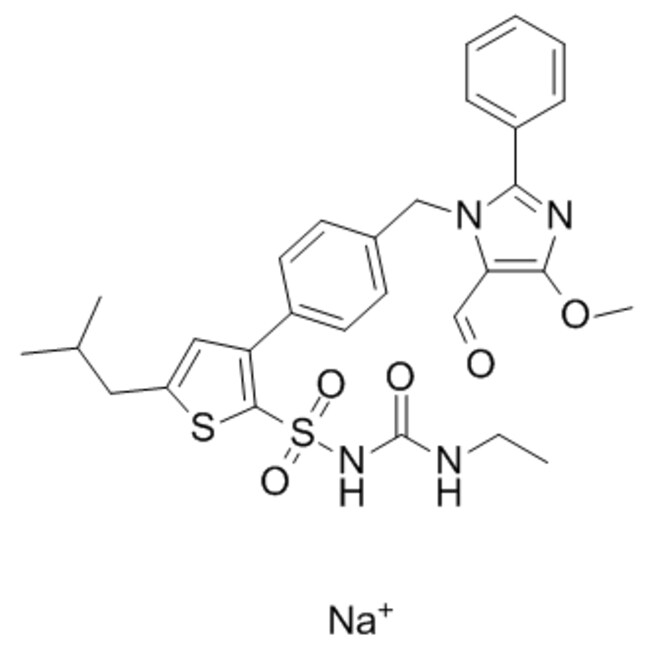 AVE 0991 sodium salt (CAS 306288-04-0) is a synthetic non-peptide agonist of the angiotensin-(1-7) receptor Mas Acting as a functional mimic of angiotensin-(1-7) AVE 0991 competitively binds to endothelial cell membranes with an IC50 of 21 35 nM in bovine aortic endothelial cells In vitro treatment with AVE 0991 promotes nitric oxide release to levels significantly greater than angiotensin-(1-7) In vivo AVE 0991 reduces urine volume and increases urine osmolality in mice effects reversed by angiotensin II antagonists indicating receptor specificity It also inhibits atherogenesis in ApoE knockout mice supporting its application in cardiovascular and renal research