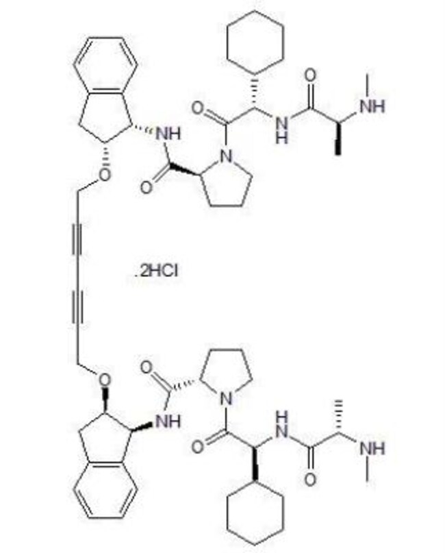 Biological Activity: Dimeric Smac mimetic; potent inhibitor of X-linked (XIAP) and cellular (cIAP) inhibitor of apoptosis protein (IC50 values are 15, 15 and 21 nM for XIAP, cIAP1 and cIAP2 respectively). Binds to the BIR3 domain of XIAP to prevent interaction with caspase-9. Causes degradation of cIAP1 and cIAP2 and induces apoptosis in MDA-MB-231 breast cancer cells. Causes tumor regression in MDA-MB-231 xenograft-bearing mice.