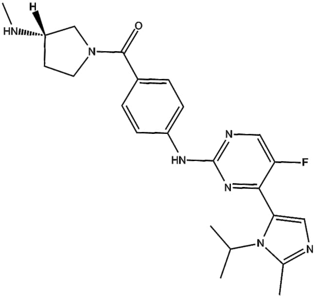 AZD-5597 (CAS 924641-59-8) is an imidazole pyrimidine amide compound that acts as a potent inhibitor of cyclin-dependent kinases CDK1 and CDK2 exhibiting an IC50 of 2 nM for both enzymes CDKs are serine/threonine protein kinases involved in regulation of the cell cycle transcription mRNA processing and neuronal differentiation In cellular studies AZD-5597 demonstrates strong antiproliferative activity such as an MIC50 of 0 039 M in LoVo cells The compound displays high aqueous solubility stability under various conditions and does not inhibit CYP enzymes Preclinical pharmacokinetic evaluations reveal favorable properties supporting its utility as a research tool for investigating CDK inhibition and antitumor activity