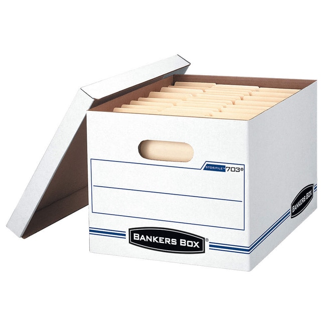 Record Storage Box, 10" Height, 12" Width, 15" Depth, 450 lb. Stacking Capacity. Lid ships attached, then tears off for storage.