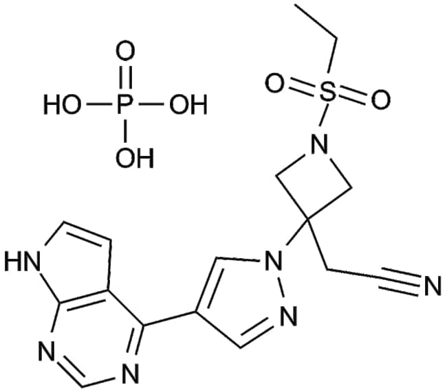 Baricitinib phosphate (CAS 1187595-84-1) known as INCB028050 is an orally bioavailable small molecule inhibitor targeting Janus kinases JAK1 and JAK2 It selectively inhibits JAK1 and JAK2 with IC50 values of approximately 5 9 nM and 5 7 nM respectively exhibiting roughly 10-fold lower potency towards JAK3 and Tyk2 and lacking inhibition against c-Met and Chk2 By suppressing JAK1/2-mediated signaling baricitinib phosphate reduces signal transduction induced by proinflammatory cytokines such as IL-6 and IL-23 in vitro Preclinical studies in rodent arthritis models indicate notable therapeutic activity with minimal evidence of adverse hematological or immunosuppressive effects This compound is used widely in biomedical research for investigating inflammatory pathways in autoimmune disease models