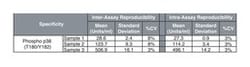 - Human and mouse reactivity was determined by testing cell lysates with the BD CBA Phospho p38 (T180/Y182) Flex Set