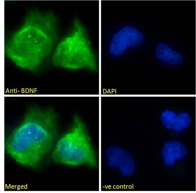 BDNF (Brain-Derived Neurotrophic Factor) is a member of the neurotrophin family. BDNF is synthesized as pre-proBDNF, followed by cleavage to proBDNF. Although further processing generates the mature, 14 kDa protein, pro-BDNF is biologically active and is secreted in synaptic vesicles along with the mature form. BDNF is widely expressed in the central nervous system and acts in an autocrine and paracrine manner on several classes of neurons. Signaling occurs mainly through the tyrosine kinase receptor TrkB, although binding to the lower-affinity receptor, p75-NTR, has also been demonstrated. BDNF promotes neuronal survival and differentiation and has been shown to play a critical role in memory formation and synaptic regulation. BDNF is induced by cortical neurons, and is necessary for survival of striatal neurons in the brain. Expression of BDNF is reduced in both Alzheimer's and Huntington disease patients, and may also play a role in the regulation of stress response and in the biology of mood disorders.