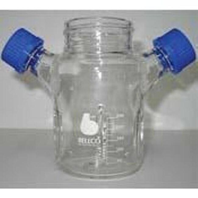 Bellco Glass, Inc. Manufactured from type 1 class a Borosilicate glass. Bottom indent and 3 vertical baffles for optimal mixing. Sidearm cap: 45mm Center cap: 70mm Dimensions: 1110" x 175" Flask size: 500ml