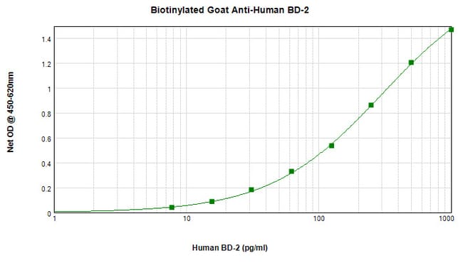 AA Sequence of recombinant protein: GIGDPVTCLK SGAICHPVFC PRRYKQIGTC GLPGTKCCKK P. Preparation: Produced from sera of goats immunized with highly pure Recombinant Human BD-2. Anti-Human BD-2-specific antibody was purified by affinity chromatography and then biotinylated. Sandwich ELISA: To detect hBD-2 by sandwich ELISA (using 100 μL/well antibody solution) a concentration of 0.25-1.0 μg/mL of this antibody is required. This biotinylated polyclonal antibody, in conjunction with PeproTech Polyclonal Anti-Human BD-2 (500-P161G) as a capture antibody, allows the detection of at least 0.2-0.4 ng/well of Recombinant hBD-2. Western Blot: To detect hBD-2 by Western Blot analysis this antibody can be used at a concentration of 0.1-0.2 μg/mL. Used in conjunction with compatible secondary reagents the detection limit for Recombinant hBD-2 is 1.5-3.0 ng/lane, under either reducing or non-reducing conditions. 500-P161GBT-1MG will be provided as 2 x 500 μg
