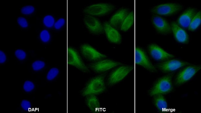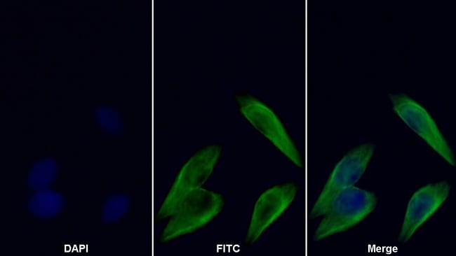 Beta tubulins are one of two core protein families (alpha and beta tubulins) that heterodimerize and assemble to form microtubules. Beta-III tubulin is primarily expressed in neurons and may be involved in neurogenesis, axon guidance and maintenance. Mutations in the beta tubulin gene are the cause of congenital fibrosis of the extraocular muscles type 3. Beta-III tubulin was also detected in Sertoli cells of the testis and transiently in non-neuronal embryonic tissues. Glutamate residues at the C-terminus of beta III tubulin can be glutamylated. The precise function of such modifications is unclear. Tubulin is phosphorylated on Ser-172 by CDK1 during cell cycle progression. Ser-172 phosphorylation inhibits tubulin incorporation into microtubules.Microtubules, the major cytoskeletal elements found in all eukaryotic cells, consist of Tubulin, which is a dimer of two 55 kDa subunits: alpha and Beta. Microtubules play key roles in chromosome segregation in mitosis, intracellular transport, ciliary and flagellar bending, and structural support of the cytoskeleton. Because beta-tubulin is ubiquitously expressed in all eukaryotic cells, it is frequently used as a loading control for assays involving protein detection, such as Western blotting.