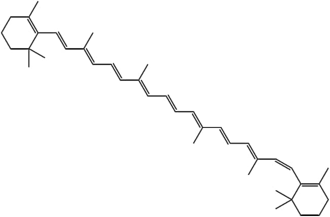 Betacarotene (CAS 7235-40-7) is a hydrocarbon-based tetraterpenoid pigment widely present in plants and fruits Structurally composed of eight isoprene units (40 carbon atoms) arranged linearly with terminal beta-ring formations betacarotene exhibits potent antioxidant characteristics Biologically it serves as a precursor to vitamin A (retinol) undergoing oxidative cleavage to retinoids and thus modulates the activity of retinoic acid receptors involved in gene transcription Betacarotene s antioxidant properties enable it to scavenge reactive oxygen species mitigating oxidative damage in cellular models It is frequently studied in vitro and in vivo to investigate mechanisms underlying oxidative stress inflammation and vitamin A metabolism pathways