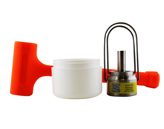 Place frozen tissue into pre-chilled chamber, insert pestle and strike with a hammer. The compression force of the pestle instantly turns brittle tissue into fine powder. Powdered tissue transfers easily without loss by inverting unit over a test tube. Supplied with hammer.