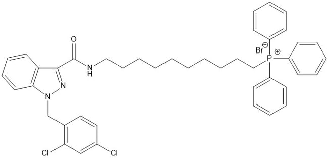 Biochemical Reagents, Mito-lonidamine, Mitochondria-targeted antiglycolytic agent, CAS 2361564-49-8, 98% by TLC/NMR (Conforms), Antiglycolytic drug with limited efficacy.1,2 Mito-lonidamine (2361564-49-8) is lonidamine conjugated to a triphenylphosphonium moiety via a decyl-linker which is an effective mitochondria-targeting group.3 Mito-lonidamine was shown to be100-fold more potent than lonidamine. It is a tumor-selective inhibitor of oxidative phosphorylation inhibiting mitochondrial bioenergetics in lung cancer cells and suppressing lung cancer cell viability, growth, progression and metastasis of lung cancer xenografts in mice.3