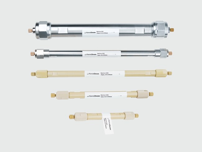 BioCore SAX is a family of high-performance, strong anion-exchange columns designed for separating charged variants in low pI proteins, such as fusion proteins. Its column technology involves the creation of a hydrophilic quaternary ammonium functional layer on the surface of monodispersed, nonporous, spherical PS/DVB particles, combined with well-established column packing processes.