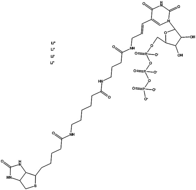 Biotin-16-UTP is a biotin-labeled uridine triphosphate used for RNA detection and purification The biotin label allows RNA molecules to bind with streptavidin or anti-biotin proteins facilitating specific RNA detection and purification In in vitro transcription reactions Biotin-16-UTP can be incorporated into RNA molecules generating biotin-labeled RNA This labeled RNA has wide applications in RNA-protein interaction studies RNA detection and RNA purification Additionally biotin-labeled RNA can be applied in in vivo experiments to investigate RNA localization and function within cells