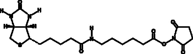 A compound used to attach biotin to primary amines, such as those found on lysines on the surface of proteins; contains six-atom spacer arm