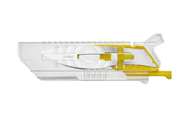 The blade management system allows for effortless safe attachment and removal of surgical blades from a standard handle. Swann-Morton surgical blades are the highest-quality. The blades are stainless steel.