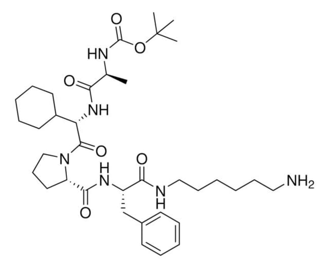 Protein degrader building block BocA1V2PF1-NHC6-NH2 enables the synthesis of molecules for targeted protein degradation and SNIPER (specific and non-genetic inhibitor of apoptosis protein (IAP)-dependent protein erasers) technology. Developed in partnership with ComInnex, this conjugate contains an in silico-derived IAP-recruiting ligand, an alkyl-chain crosslinker, and a pendant amine for reactivity with an acid on a target warhead. Because even slight alterations in ligands and crosslinkers can affect ternary complex formation between the target, E3 ligase, and protein degrader, many analogs are prepared to screen for optimal target degradation. When used with other protein degrader building blocks with a terminal amine, including CRBN and VHL targeted, parallel synthesis can be used to more quickly generate SNIPER and PROTAC™ degrader libraries that feature variation in crosslinker length, composition, and E3 ligase ligand. Learn more about the novel IAP ligands generated through virtual screening of AVP mimetics in our Technology Spotlight.Building blocks in this series:916978 BocA1V2PF1917966 BocA1V2PF1-NHC6-NH2916706 BocA1V2PF1-NHC10-NH2916951 BocA1V2PF1-NHPEG1-NH2917214 BocA1V2PF1-NHPEG3-NH2Technology Spotlight: Degrader Building Blocks with Inhibitor of Apoptosis Protein (IAP) In Silico-Derived LigandsIn Vivo Knockdown of Pathogenic Proteins via Specific and Nongenetic Inhibitor of Apoptosis Protein (IAP)-dependent Protein Erasers (SNIPERs)SNIPERs-Hijacking IAP activity to induce protein degradationE3 Ligase Ligands for PROTACs: How They Were Found and How to Discover New OnesPROTAC is a registered trademark of Arvinas Operations, Inc., and is used under license