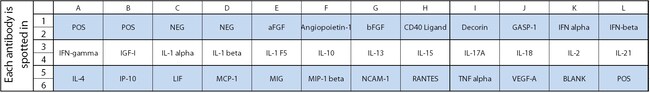 Detects 30 Bovine Cytokines. Suitable for all liquid sample types. Semi-Quantitative, Sandwich-based, Membrane Antibody Array. Screen and compare protein expression levels with high specificity and sensitivity (pg/ml levels). No dedicated equipment required. Compatible with any chemiluminescent imaging system. Proteins detected: aFGF, Angiopoietin-1, bFGF, CD40 Ligand, Decorin, GASP-1, IFN alpha, IFN-beta, IFN-gamma, IGF-1, IL-1 alpha, IL-1 beta, IL-1 F5, IL-10, IL-13, IL-15, IL-17A, IL-18, IL-2, IL-21, IL-4, IP-10, LIF, MCP-1, MIG, MIP-1 beta, NCAM-1, RANTES, TNF alpha, VEGF-A