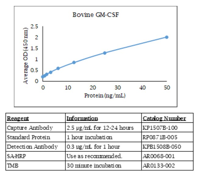 The Bovine GM-CSF ELISA contains capture antibody standard and detection antibody for development of a Bovine GM-CSF ELISA. The antibodies have been determined to function in an ELISA with the standard provided. Optimal buffers concentrations incubation times incubation temperatures and methods for the ELISA have not been determined. This allows for complete flexibility to provide optimal dynamic range and sensitivity based on your sample type. Alternate names include CSF2 GMCSF colony stimulating factor 2 CSF. The quantities of components provided are not matched. Components may also be purchased separately. For research use only. Made in the USA